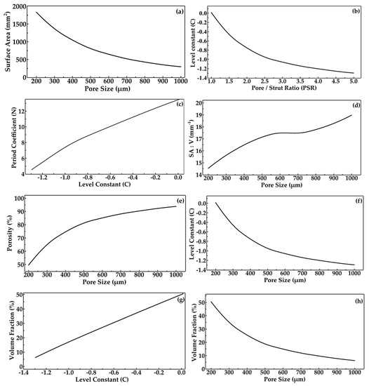 Graph of Design and Morphological Properties: variations of (a) surface area with poresize, (b) level constant with pore / strut ratio, (c) period coefficient with level constant, (d) surface area to volume ration with pore size, (e) porosity with pore size, (f) level constant with pore size, (g) volume fraction with level constant, and (h) volume fraction with pore size.