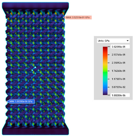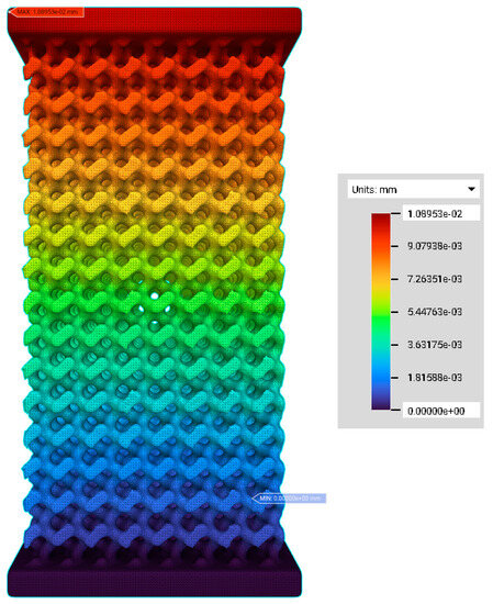 This project used the method of solid elements to simulate the given lattices (Appendix D). The advantages of using this method are that it gives high accuracy of results with consideration of edge effects and with finding the maximum stress point [49]. The solid elements use the FE volume meshes of the whole lattice. The static structural analysis was performed to calculate displacements, strains, stresses, and reaction forces on the given FE model according to the applied boundary conditions. The relationship between the compressive loads and the displacements was considered linear, with an assumption of load used slowly on the model to reach the equilibrium state and neglecting all damping and inertial forces. Compressive force, compressive strain, effective or compressive elastic modulus, relative elastic modulus, stiffness, and elastic strain energy were calculated from the reactive force and the maximum deformation values obtained from FE simulation (Table 4). The maximum von Mises stress and the maximum deformation values were obtained from the von Mises and the maximum displacement contours from the static analysis.