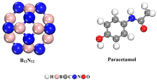Pharmaceutically active compounds are emerging pollutants that can be detected in surface water, drinking water, industrial and domestic water, and groundwater [9]. Pharmaceutically active compounds include antibiotics (ciprofloxacin, levofloxacin, nalidixic acid), nonsteroidal anti-inflammatory drugs (NSAIDs) (diclofenac, ibuprofen, naproxen), hormones, and antidepressants (meprobamate, diazepam). A very large quantity of pharmaceuticals is used around the globe to cure animal and human diseases in feedstock facilities, households, hospitals, and agriculture. However, they are not completely absorbed in the body, and the unabsorbed and unmetabolized pharmaceuticals are excreted, which finally contaminates the ground- and surface water. Similarly, the inappropriate disposal of unwanted drugs and expired ones is another source of water pollution [10]. Such contaminated wastewater is subjected to treatment in wastewater treatment plants (WWTPs), which are unable to eliminate the pharmaceuticals completely to make it suitable for drinking. In Madrid (Spain), a considerable quantity of NSAIDs was found in drinking water after treatment in WWTPs that treated wastewater in an area with pharmaceutical industries, university campuses, and hospitals [11]. Paracetamol, also known as acetaminophen, is one of the most extensively used analgesic and antipyretic drugs among over-the-counter (OTC) and most frequently prescribed drugs [12,13]. The global market for acetaminophen is expected to be value at USD 121.7 million by 2018 [14]. Paracetamol is one of the most rapidly growing emerging contaminants on the globe, and its existence has been reported earlier to be up to 200 μg/L and 28.70 μg/L in wastewater effluents and surface water, respectively [15], despite its high removal capacity of about 90% in WWTPs [16,17,18]. Researchers reported a strong tendency of paracetamols and other NSAIDs toward accumulation, sorption, and persistence in soil sediments and plants [19,20] and reported a number of toxicities of paracetamols in plants, soil, and aquiculture [21]. Different methodologies have been applied to eliminate pharmaceuticals from drinking water including membrane filtration, membranes with sorption capabilities, advanced oxidation, and adsorption [22,23]. Adsorption is the most commonly used method due to its ease of operation, low energy usage, low cost, and high efficiency [24,25,26,27]. Different adsorbents of a 2D and 3D nature have been applied for the removal of pharmaceuticals from wastewater [28]. Adsorbents such as single- and multiwall carbon-based nanotubes, graphene, activated carbon, chitosan-grafted graphene oxide composites, TiO2/GO composites, biochar, magnetic mesoporous carbon, and graphene oxide have been utilized for the adsorption of pharmaceuticals with desirable results [29,30,31,32]. However, these nanomaterials possess numerous issues, i.e., low hydrophobicity of carbon nanotubes and long-term sustainability, which make the nanomaterials difficult to separate from water and toxic to the ecosystem [33,34,35,36,37]. In recent research, aluminum nitride and boron nitride nanotubes were explored as the most appropriate candidates for the elimination of a large number of pollutants from wastewater due to their thermal and structural stability, high hydrophobicity, wide band gap, and resistance to oxidation [38,39,40]. Likewise, inorganic nanocages such as Al12N12 and B12N12 have been employed for the adsorption of pollutants due to their distinctive surface and their physical and chemical properties [41,42,43,44]. They were used experimentally for the abatement of aspirin [45] and for the removal of toxic gases like NH3, ClCN, and HCN [46,47]. Additionally, Al12P12 nanocages were used for the effective sensing of CH3Cl and CH3F [48]. The B12N12 nanocage [49] was synthesized by employing the arc-melting method from YB6 powder, and four- and six-membered rings were found in the nanocage. The B12N12 nanocage possesses substantial properties such as oxidation resistance, structural and thermal stability, and high surface area and can be used effectively for the abatement of paracetamol from wastewater.