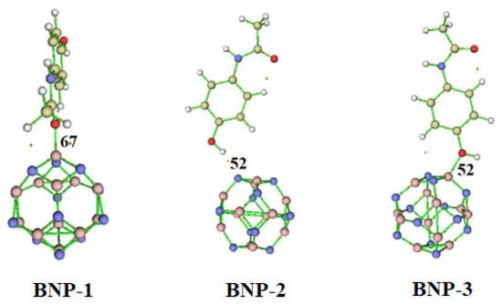 As a result, we investigated three distinct interaction modes between paracetamol and B12N12, labeled as complex-1 (BNP-1), complex-2 (BNP-2), and complex-3 (BNP-3). The optimized configurations of all the above-mentioned complexes are illustrated in Figure 3. In BNP-1, the boron atom of the nanocage forms a bond with the oxygen atom (O) of the C=O group of the adsorbate, resulting in a computed O–B bond length of 1.55 Å. In BNP-2, the calculated bond length between the H atom of O–H and the nanocage was 1.97 Å, while in BNP-3, the bond length between the O atom of O–H and the boron atom of the nanocage was observed to be 1.66 Å. The adsorption energies of BNP-1 and BNP-3 indicate that they interact via chemisorption, with an Eads of −27.94 kcal/mol, whereas the adsorption energy of BNP-2 shows that it interacts via physisorption, having Eads values of 15.3125 kcal/mol as mentioned in Table 1.