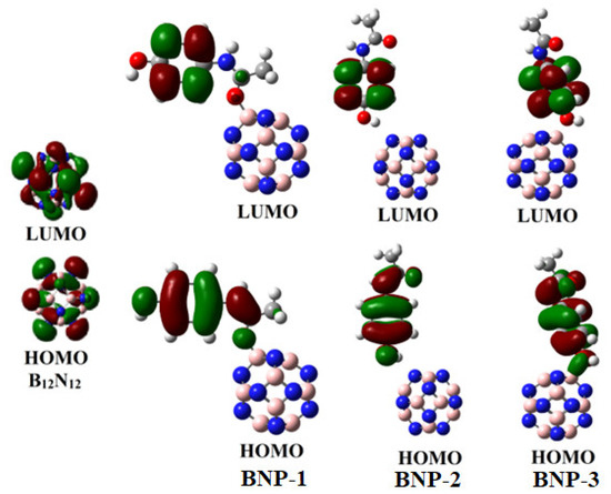 The confirmation of the binding of paracetamol onto the B12N12 nanocage was further studied by analyzing the frontier molecular orbitals (HOMO–LUMO) of the nanocage, paracetamol, and complexes. The corresponding figures and results can be found in Figure 6 and Table 1, respectively. According to Figure 6, the B12N12 nanocage demonstrates distinct HOMO and LUMO distribution, with the HOMO predominantly spread over the nitrogen atom while the LUMO is localized on the boron atom. The binding of paracetamol onto the B12N12 nanocage induces remarkable changes in the HOMO–LUMO distribution. In the cases of BNP-1, BNP-2, and BNP-3, the LUMO is primarily concentrated on the cyclic ring of the paracetamol, while the HOMO involves the O─H and the cyclic ring, with a particular focus on the interacting position in BNP-1 and BNP-3. These observations indicate substantial charge transfer and a strong interaction between paracetamol and the B12N12 nanocage. On the other hand, the HOMO exhibits marginal separation from the interacting atoms of both the paracetamol and the B12N12 nanocage, leading to minimal orbital overlap and negligible charge transfer. These observations suggest very weak interactions in these cases.