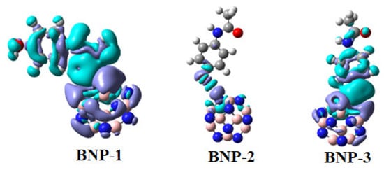 The electron density difference (EDD) analysis was performed to investigate the intermolecular interactions between the paracetamol and the B12N12 nanocage. Figure 7 illustrates the plot of the EDD for all three complexes. The EDD was performed by calculating the difference in electron density between the complexes and sum of the isolated species, namely, paracetamol and the B12N12 nanocage. The ED of the individual species is determined by using the coordinates from the relaxed geometries of the complexes. The EDD plots of the complexes reveal blue and green regions, which signify the orbital contact between the paracetamol and the B12N12 nanocage. Furthermore, BNP-1 and BNP-3 show a huge green loop between the interaction sites of paracetamol and the B12N12 nanocage, providing strong evidence of significant interactions and substantial charge transfer from paracetamol to the B12N12 nanocage. In BNP-2, the size of the blue and green loops is very small, indicating minimal overlap and weak interactions. These findings from the EDD analysis are consistent with the charge transfer analysis.