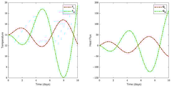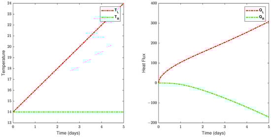 The thermal conductivity, K, and heat capacity C are assumed constants by letting . Temperature and heat flux time series are generated over 10 days and assuming that the measurements are recorded every 5 minutes. A visualization of the Dataset 3 time series is provided in Figure 6.