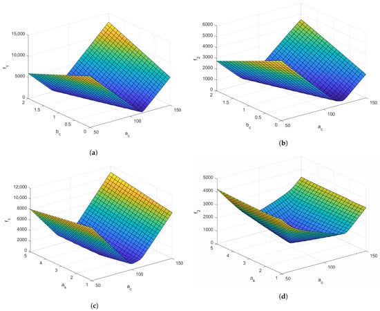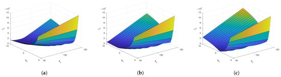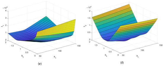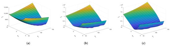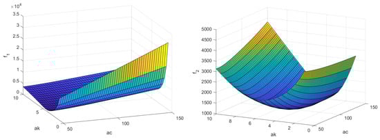 To visualize the objective functions, we fix at three values which produce the surface graphs in Figure 4 and Figure 5. It can be seen that for both functions as increases, the plotted surfaces flatten in the direction of .