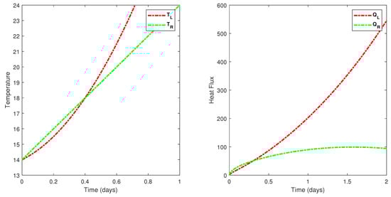and assuming , and . Temperature and heat flux values are assumed to be recorded every 5 minutes for 10 days. The resulting temperature and heat flux time series are presented in Figure 3. In this case, is less than at the beginning, but then becomes greater than . The efficiency of Approach 1 is expected to degrade in such situations.