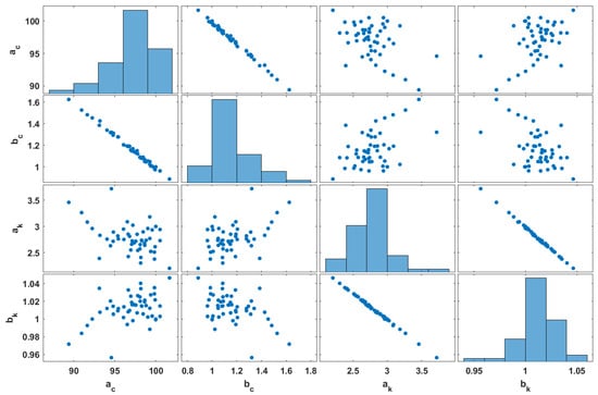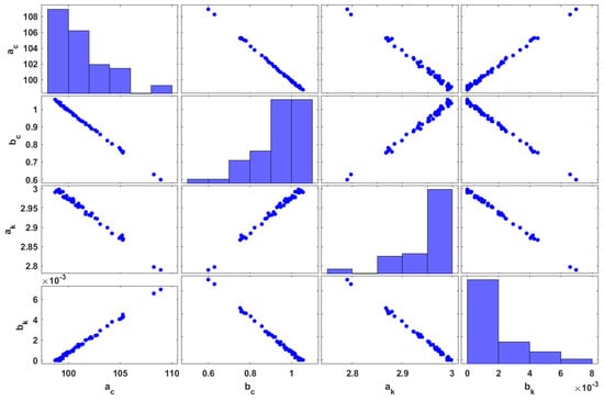 The estimated parameters from Algorithm 2 can be further analyzed by looking at their bivariate correlations. Scatter plots of the 50 samples are presented in Figure 9. The heat capacity parameters, and , are highly correlated. A similar conclusion can be drawn for the thermal conductivity parameters, and . Other combinations of parameters show only moderate correlations. This observation is crucial when making f predictions, as random perturbations of these parameters will not produce realistic physical simulations.