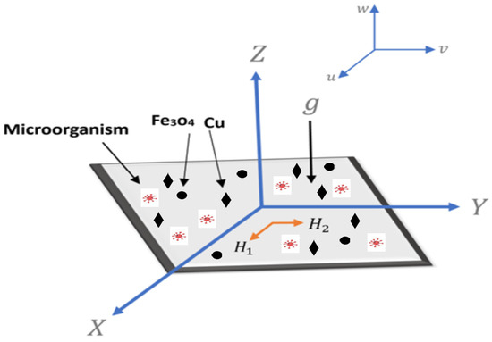 A directly stretching plate below an external magnetic flux is considered assuming continuously laminar-varied convection compact viscous and electrically coupling pressure in Fe3O4-Cu/water hybrid nanofluid. This is defined and illustrated in Figure 1. Different kinds of motile bacteria are swimming through the nanofluid at their fastest potential speed . The surface of the stretching sheet has an injection action, and the sheet is permeable. Additionally, the sheet’s suction/injection velocity is , whereas represent the electric conductivity and density of the hybrid nanofluid, is the sheet temperature. The fluid’s velocity components are denoted by the symbols and . The equation for concentration continuity yields the volumetric percentage of nanoparticle concentration, c. A microorganisms’ continuity equation is also provided to complete the present example’s mathematical model. Figure 1 shows the physical model, whereas Equation (1) through Equation (8) define the mathematical model.