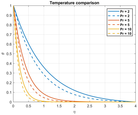Prandtl number , temperature comparison; dashed lines for our study, solid for H. Waqas et al. [49].