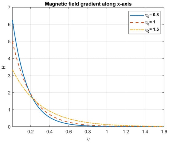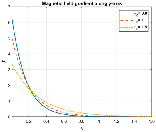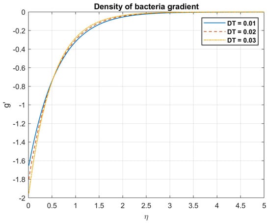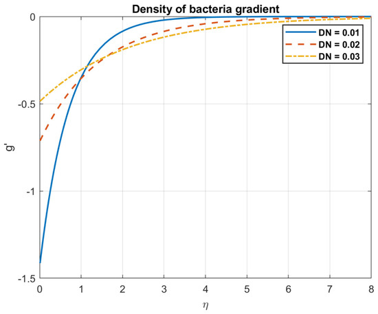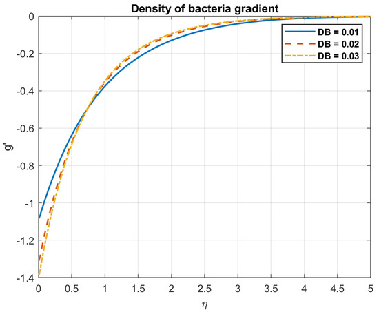 Examining the impact of magnetic diffusivity, it is shown that an increase in values result in a decrease in both the magnetic field and nanofluid velocity. Because magnetotactic bacteria align with magnetic fields, they can affect the fluid flow patterns in bioconvection fluids. These bacteria’s alignment has the potential to alter the fluid’s effective viscosity and anisotropy, which will have an impact on the velocity field. The way the magnetic field interacts with the bacteria and modifies the fluid flow can be influenced by the medium’s magnetic diffusivity. Increased magnetic diffusivity can cause the magnetic field to dissipate more quickly, which will weaken the magnetotactic bacteria’s alignment. This might lead to a decrease in the effects of bioconvection and a weaker magnetic field modulation of the velocity field. The results are shown in Figure 9, Figure 10, Figure 11, Figure 12, Figure 13, Figure 14, Figure 15 and Figure 16.
