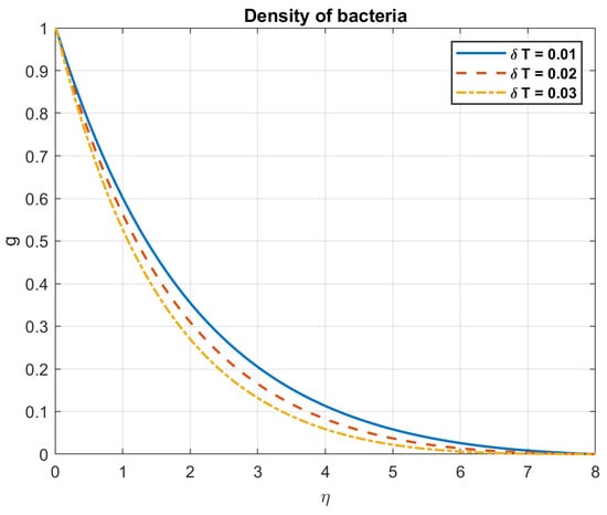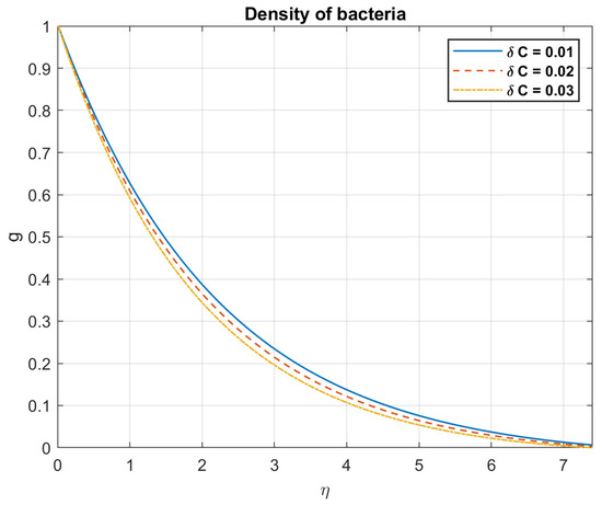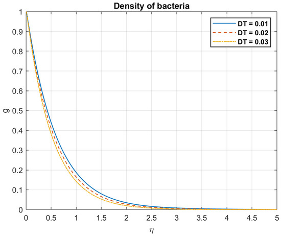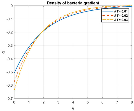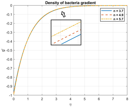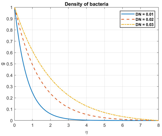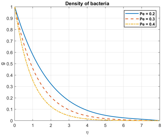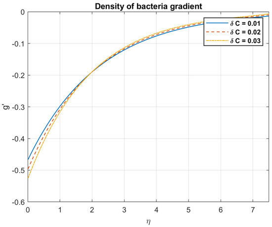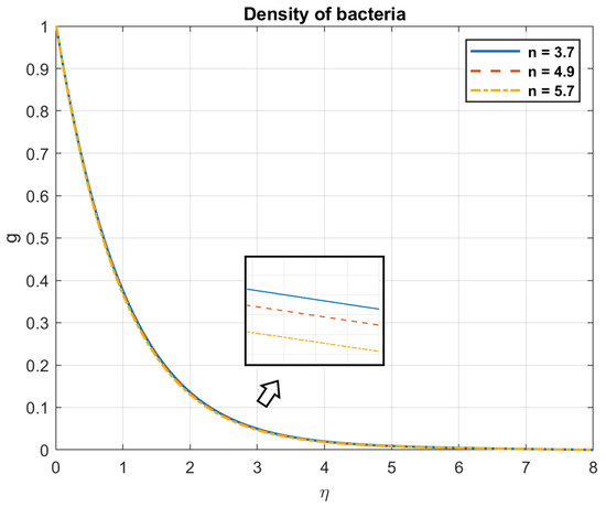 Examining the impact of Prandtl number, it is found that when values rise, so do the temperature, heat flow, nanoparticles, and bacterial density. This is because fluids with a high Prandtl number ( >> 1), such as oils or water, have a low heat conductivity in relation to their viscosity. Larger temperature gradients and a less uniform distribution of temperatures occur from the slower transport of heat. The heat flow is influenced by the Prandtl number. A fluid with a high Prandtl number will typically have a low heat flux for a given temperature difference. This is because a fluid with a low Prandtl number has reduced viscosity and better thermal conductivity, which enables it to transmit heat more effectively. The way that nanoparticles behave while suspended in a fluid is also influenced by the Prandtl number. This is due to the fact that nanoparticles can improve convective heat transfer by raising the fluid’s effective thermal conductivity, encouraging mixing, and facilitating fluid motion. Figure 3, Figure 4, Figure 5, Figure 6, Figure 7 and Figure 8 exhibit these observations.
