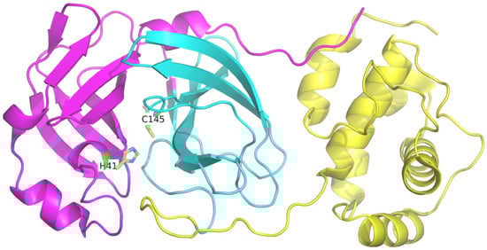 A 3D structure of SARS-CoV-2 Mpro has been established for unliganded protein, as well as for numerous complexes (more than 700 reports in RCSB PDB by summer 2023, see, e.g., 6LU7 as one of the first entries [17]). Its homodimer is asymmetrical and heart shaped. A protomer has 306 residues and consists of three domains [32], see Figure 1. Domains I (residues 8–101) and II (residues 102–184) are mostly beta strands while domain III (residues 185–306) consists of five alpha helixes and is connected with domain II via a long loop. Mpro’s catalytic dyad, namely His41 and Cys145, is located on an active site in a gap between domains I and II, see Figure 1. Cysteine residue Cys145 acts as a nucleophile, while histidine His41 is a proton acceptor [17,33]. Nucleophilic attack of the S atom of Cys145 on the main chain carbonyl C atom of pp1a or pp1ab leads to the formation of acyl-enzyme intermediate and the subsequent proteolytic cleavage; in total, 11 conserved cleavage sites are known [17,34].