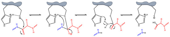 The catalytic mechanism of Mpro is known [62] and based on the Cys145 sulfur atom nucleophilic attack at the carbonyl carbon atom of the target protein main chain (Figure 2). Covalent bonding of the cysteine residue blocks the active site and leads to the inactivation of protease. Deprotonated cysteine is highly nucleophilic, one should hence consider the electrophilic group as a warhead (i.e., functional groups, which create a covalent bond with the amino acid, involved in biocatalysis) of any inhibitor.