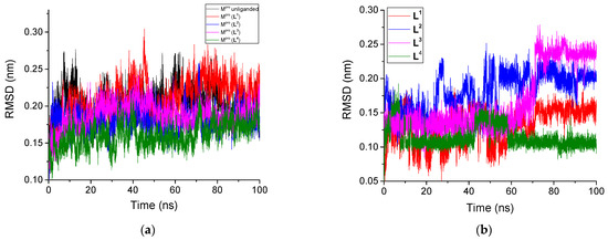 Unliganded protein and protein–ligand complexes, which have a higher docking score, were simulated in a water box for 100 ns, in order to describe better the interactions between the protein and the ligand. Trajectories were analyzed by using RMSD and RMSF to check the stability of the complexes. RMSD values were calculated for protein Cα atoms and for all ligand atoms. Mean RMSD values for protein and ligands in all systems are listed in Table 3. It was observed that the RMSD value of protein in four protein–ligand complexes and of the unliganded protein fluctuates around 0.2 nm for all of the systems, indicating their stability (Figure 5a). For all ligands, except L1, the mean RMSD value for the protein was slightly lower than the value for unliganded protein, suggesting some stabilization. For L4, the decrease in RMSD was rather high, about 20%. The RMSD value of the ligands fluctuated around 0.2 nm (Figure 5b), indicating the stability of the ligands at the active site. Figure 5b illustrates that L4 is the most stable one among other ligands. For L2 and L3 some large fluctuations were observed. One can suggest that the ligand underwent significant conformational changes. Visual analysis supports this viewpoint, see Section 4 Discussion.