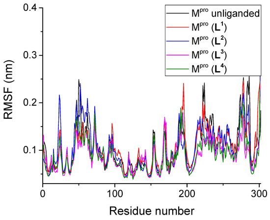 The Cα atoms’ RMSF was used to calculate the fluctuation of each amino acid of the protein (Figure 6). A higher RMSF value means a higher amino acid fluctuation, while a lower RMSF value means a higher stability of the residue. The average value of RMSF was calculated to be 0.109 for unliganded Mpro, 0.107 for Mpro + L1, 0.100 for Mpro + L2, 0.096 for Mpro + L3, and 0.088 for Mpro + L4 (Table 3). In general, RMSF plots for each complex were similar, as well as for unliganded protein. We can speculate that ligands do not perturb the protein stability during the 100 ns MD simulation. Moreover, a comparison of average RMSF values showed that the presence of a ligand led to some stabilization of the protein, especially in the case of L4.