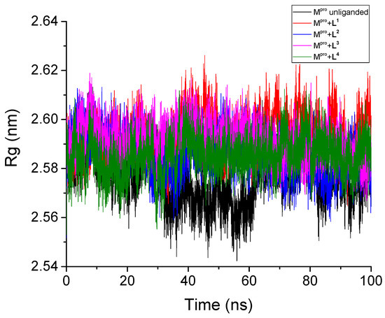 The radius of gyration is a measure of protein size and compactness. Mean Rg values for all studied systems are listed in Table 3. Rg time dependencies are shown in Figure 7. It is seen that there is no variance between different complexes and between the complexes and unliganded protein, so the geometry of Mpro is the same for all systems. No significant changes occurred during the simulation, only a small decrease in Rg could be noted for pure Mpro at a time interval of 30–60 ns.