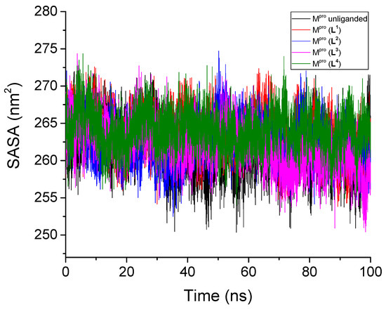 Solvent-accessible surface area (SASA) is the surface area where the protein or a ligand interacts with solvent molecules. It correlates with the interactions between the complex and the solvent during the simulation analysis. The SASA values for unliganded Mpro, four protein–ligand complexes, as well as for four ligands, were calculated and plotted vs. simulation time (Figure 8); the corresponding mean values are listed in Table 3. A change in SASA value can be referred to as a change in protein conformation. What is more, SASA values are stable, and no drastic changes occur. A comparison of the average values for different systems revealed that they are not different from each other.