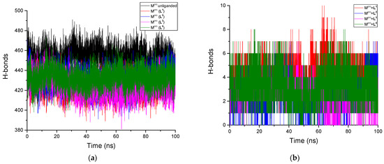 Figure 9b shows the time dependencies of the number of protein–ligand H-bonds; average numbers are listed in Table 3. The L1 forms the largest number of H-bonds, which is related to a large number of donor and acceptor groups, and probably with their favorable spatial distribution. L4 shows also a large number of H-bonds, whereas the binding of L2 and L3 is much poorer.