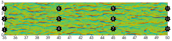 All probes were positioned on the wall’s surface () and were equidistant both in the streamwise (x) and spanwise (z) directions (i.e., at fixed intervals of 5 and 1 length units (normalized by the reference length mm)), respectively, as per Figure 1. Note that the inflow was prescribed a uniform flowfield superimposed with von Kármán-like atmospheric perturbations with a turbulence intensity equal to 1% of the freestream velocity. The transition occurred between , and the flow became fully turbulent by . Thus, all probes were located within the fully turbulent boundary layer (TBL) region. The periodic boundary condition employed in the spanwise direction and the planar wall surface ensured that the turbulence signals between the three probes in the same streamwise direction were statistically homogeneous. In the streamwise direction, the TBL gradually grew, and thus the turbulence statistics became increasingly dissimilar relative to the training probe (number 2). The latter can be corroborated, for example, by the changes in the pressure signal power spectrum shown later in Section 4.2.