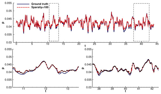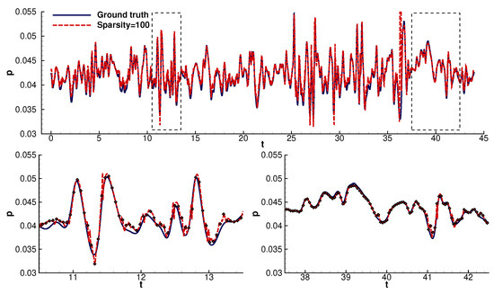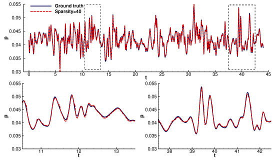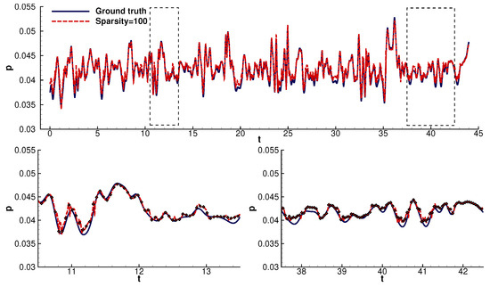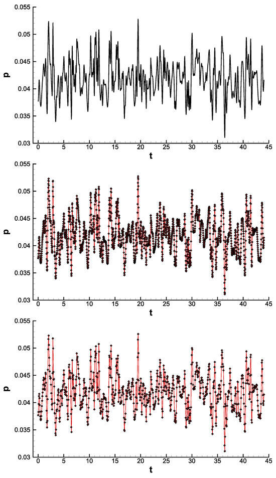 Illustration of pressure fluctuation for probe 2 in the time domain: (top) original signal, (middle) sparsity = 40, and (bottom) sparsity = 100. All values are dimensionless.