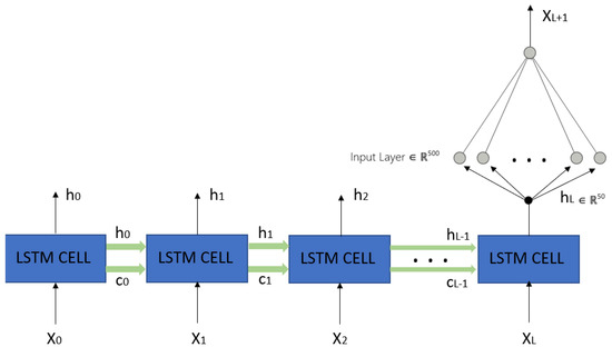 High-level schematic of the neural network architecture. The length of the sequence L is dynamic and depends on the sampling step . The symbols and denote the LSTM cell’s hidden state and cell state outputs, respectively. The model’s inputs and output are and , respectively.