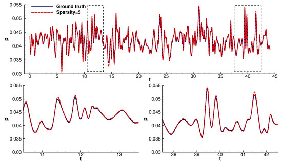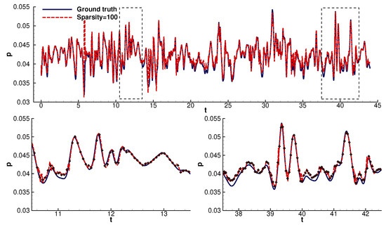 The cut-off dimensionless frequencies (Strouhal numbers) corresponding to sparsities of 5, 40, and 100 were , , and , respectively. The results in Figure 11 indicate, however, that for a sparsity equal to 5, the effect from the LSTM reconstruction began to affect the power spectrum from a much lower frequency, specifically , instead of at its corresponding cut-off value of . For short time intervals (high frequencies) relative to the intrinsic time scale of the pressure fluctuations, the LSTM interpolation predictions were poorer than those for simpler linear interpolation methods. For example, cubic spline interpolation had little to no effect until its corresponding cut-off frequency, a value which was much higher than the plotted frequency range.