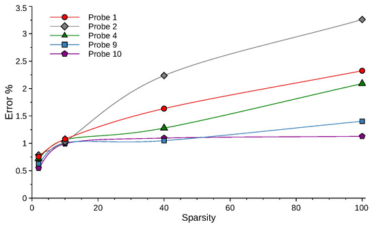 - The normalized RMSE of reconstruction increased linearly up to a sparsity factor of 20. Then, the error’s rate of reduced, but the error variance between different probes increased.