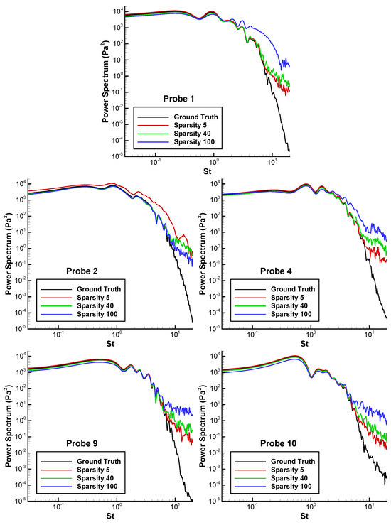 The objective here is to examine the accuracy of the LSTM predictions of the power spectra. The results for different probe positions and sparsity factors are presented in Figure 11, where the frequency (x) axis relates to the dimensionless Strouhal number as defined previously in Section 2.3.