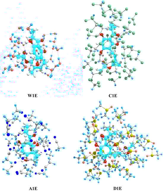 Optimized geometries of the caespitate—explicit solvent systems calculated with the ONIOM (ωB97X-D3/Def2-TZVP:XTB2) method obtained from the most stable conformers in implicit solution in water (W1E), chloroform (C1E), acetonitrile (A1E), and DMSO (D1E).