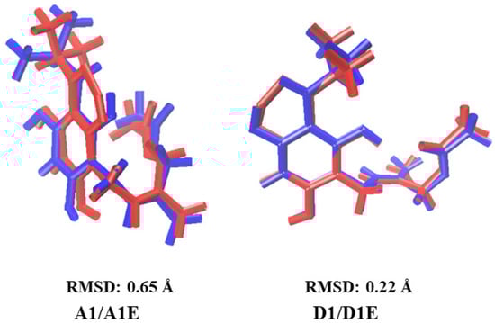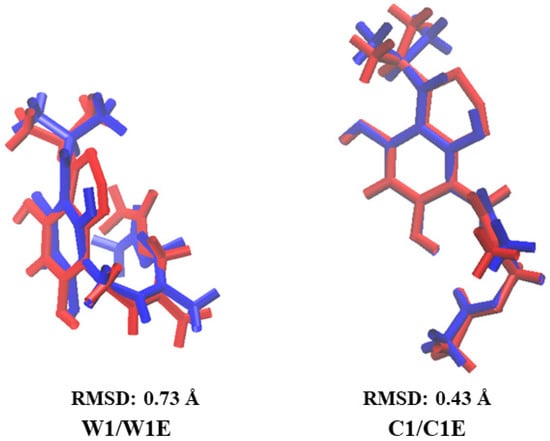 Comparison of the optimized structures of the most stable conformer in implicit solvent, water (W1), chloroform (C1), acetonitrile (A1), and DMSO (D1) (in red color), with the corresponding structure in explicit solvent, in water (W1E), chloroform (C1E), acetonitrile (A1E), and DMSO (D1E) (in blue color).