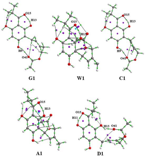 Molecular graphs of the most stable conformers of caespitate calculated at the APFD/6-311+G(2d,p) level of theory in gas and solution phases. Gas (G1), water (W1), chloroform (C1), acetonitrile (A1), and DMSO (D1) phases.