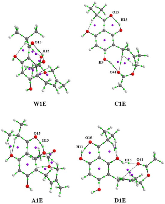 Figure S6 shows the molecular electrostatic potential (MEP) map in the gas and implicit solution phases. It is observed that the highest electron density (red regions) is concentrated on the O atom of the –OH group in the para position of the aromatic ring and slightly on the O atom of the acyl group in the conformers W1 and A1, while in the conformers G1, C1, and D1, the highest electron density is concentrated on the O atom of the acyl group and the O atoms of the three –OH groups of the aromatic ring. The electron density-deficient zones (blue regions) are around the H atom of the –OH group in the ortho position in the conformers G1, W1, C1, and A1, while in D1 it is around the H atom of the –OH group in the para position. In both cases, this H atom does not form a hydrogen bond. Another area of low electron density is on the methyl ester group of the prenylated chain in all conformers. Figure S7 shows the MEP map from explicit solution systems. In general, the highest electron density is concentrated on the aromatic ring, the O atom of the –OH groups in the ortho and para positions of the aromatic ring, the O atom of the acyl group, and the O atom of the ester group of the prenylated chain of the conformers C1E and D1E, while in the conformers W1E and A1E, the highest electron density is concentrated on the O atom of the carbonyl group and the O atom of the ester group of the prenylated chain. The electron density-deficient zones are observed in the prenylated chain in conformers C1E and D1E, while for W1E and A1E, these regions are observed on the methyl groups and some protons of the aromatic ring.