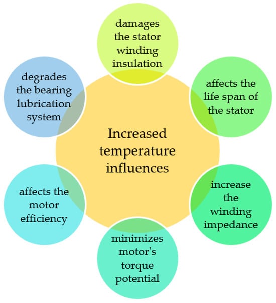 Figure 3. An elevated temperature has a consequence on numerous elements of motor function. An induction motor’s efficiency declines as the winding temperature increases. As the winding temperature is raised, the input energy consumption increases. Raising the winding temperature of the motor induces the motor torque to fall and the motor efficiency to deteriorate. The stator winding temperature is critical to understand, as it damages the insulation system since high temperatures affect the life span of the stator. The temperature affects the winding impedance and the magnetic flux density. Whenever the temperature of the motor rises, the winding impedance increases. This may harm the motor’s maximum torque potential at maximum speed as well as its efficiency. Whenever the temperature of the material rises, atomic oscillations cause previously oriented magnetic dipoles to “dynamically resize”, resulting in a drop in the intensity of the magnetic flux. Hence, the flux density of the magnetic materials will diminish as the temperature rises. The torque falls as the magnetic field intensity decreases. As a result, a drop in the magnetic flux and an increase in the inductance will have a substantial influence on the motor’s efficiency. The operating temperature of the motor has the highest influence on the element durability for both the bearings and the stator winding. An excessive bearing temperature will degrade the lubrication system, leading to the need for frequent lubrication, as shown in