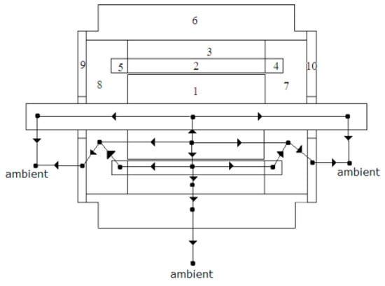 26] used a Y 90S-2 three-phase squirrel-cage rotor induction motor and produced a thermal network with 10 nodes and 14 thermal resistances. The stator of the motor had networks for the stator iron, stator windings, and end windings. The heat transfer to the stator from the rotor windings through the air gap occurred immediately with an insignificant effect on the stator teeth. Finally, the rotor, stator, and frame were connected through thermal resistances. The following components are those that were considered for modeling the thermal networks in this study: the rotor bars, slot stator windings, stator core, right end windings, right end-cap air, left end windings, left end-cap air, round frame, right side frame, and left side frame. The models were made based on the main heat flow paths as represented in the motor shown in