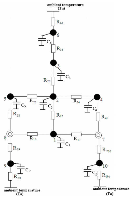 19]. The thermal network of an IM is not much different if we think of the electric resistance as thermal resistance, current sources as power sources, electric capacitors as thermal capacitors, voltage as nodal temperatures, and the current flowing through resistance as the power flow. All these thermal resistances, thermal capacitance, and component geometries of a motor can be determined mathematically. These parameters and associated losses are fitted into thermal networks to obtain the temperature distributions across the motor at different operating conditions [