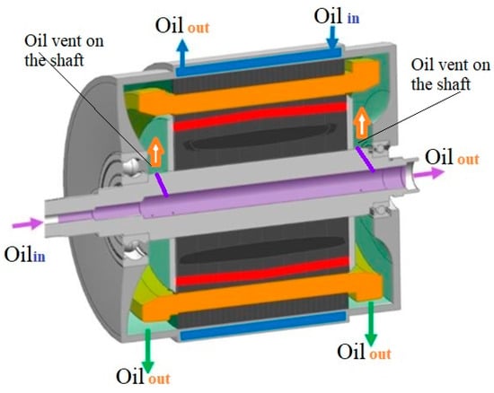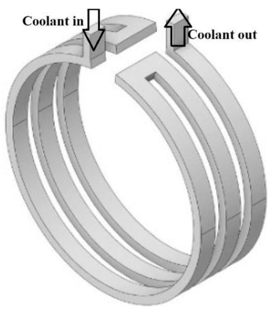 40]. Cooling is mostly carried out based on the slot conduction and end windings in the motor. A cooling jacket is also helpful for the cooling process. A system with a good efficiency is crucial to minimizing the working temperature of the hotspots in a motor, especially in the copper windings. Therefore, reliable and precise modeling of the cooling system and the design of the motor is very important for the optimization of the thermal management of the motor [