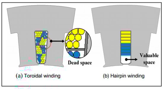 15]. Since the winding is a major source of heat and its insulation is thermally sensitive, lowering the winding temperature is critical to improving the motor’s stability. An enhanced power loading and a high torque density necessitate a wide-end winding. The losses in the system are controlled by those from the winding owing to the reduced speed and application of high torque [