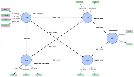The hedonic value shows an AVE of 0.959, which is exceptionally high compared to the square correlations with other constructs, indicating excellent discriminant validity and affirming the uniqueness of the emotional pleasure associated with the brand in the model. Finally, the utility value has an AVE of 0.754, which also indicates good discriminatory validity, although the square correlation with brand experience is relatively high (0.766), which could indicate a close conceptual association. Together, these results establish the discriminatory validity of the constructs within the model, with each reflecting a distinctive and measurable aspect of the proposed underlying theory. This is crucial to ensuring the proper interpretation of structural relationships and confidence in the theoretical conclusions derived from the model.