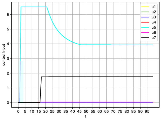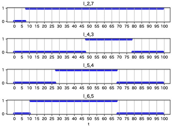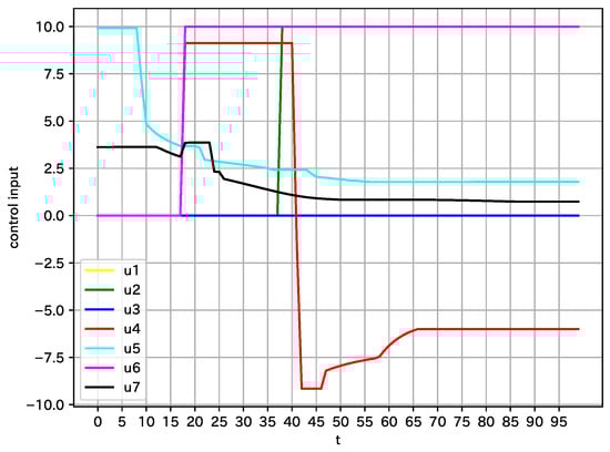 Finally, we comment the computation time for solving the problem at each time. The mean computation time and the worst computation time were 8.7 s and 29.4 s, respectively. Here, we used the computer with CPU: Intel Core i5-12600K 3.69 GHz and Memory: 16 GB, and used the CBC (COIN-OR Brand-and-Cut) 2.10.3 [27] https://github.com/coin-or/Cbc (accessed on 1 September 2024) as an MILP solver. Reducing the computation time is one of the future efforts.