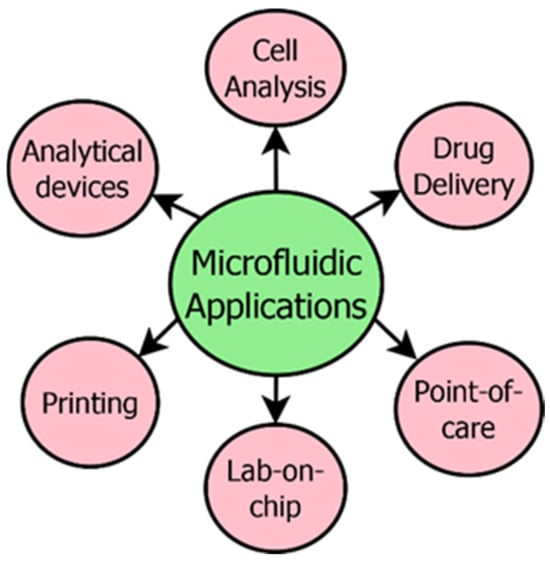 The measurement of physical variables has been one of the primary concerns in places where efficiency and accuracy are of utmost importance. Over the years, several physical variables, such as temperature, flow, pressure, speed, humidity, and pH, have been measured with different principles and in various dimensions. Owing to advances in science and technology, the miniaturization of devices has been achieved to meet the demands of the production industry and medical equipment. The nanometer technologies of the semiconductor industry have changed the perspective on miniaturization. These advances have led to the development of meters to measure physical variables at dimensions less than a millimeter. One such metering concept is called microfluidics, which measures the flow rate. Microfluidics is the branch that deals with the flow at a micro level in devices with length scales less than a millimeter [1,2,3]. The few listed applications of microfluidics are shown in Figure 1.