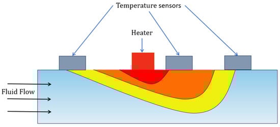 Several types of flowmeters have been developed via microelectromechanical system (MEMS) technology, capitalizing on thermal, Coriolis, ultrasonic, and mechanical flow effects [15,16,17,18,19]. A single heater enables a simple thermal flowmeter to function by regulating the heater temperature with consistent heating power or modulating the power accordingly to keep the heater temperature constant. However, one of the main challenges with thermal flowmeters is the slow response time (>1 min) [20]. Figure 2 illustrates the principle of calorimetric flow in a thermal flowmeter.