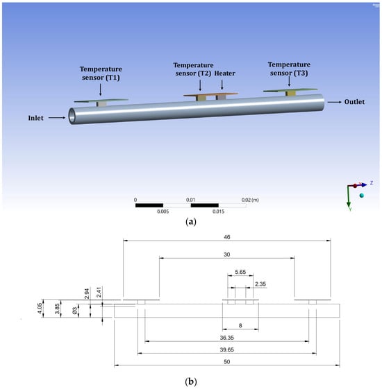 (a) Front view schematic illustration of the thermal flowmeter. (b) Dimensions of the modeled thermal flowmeter in mm.