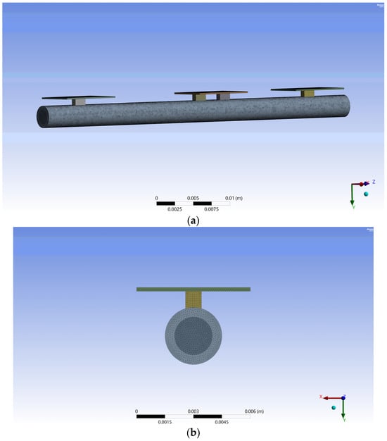 Figure 3a,b represent the thermal micro-flowmeter. The thermal micro-flowmeter along the silicone pipe measures 50 mm in length. The outer diameter of the pipe is set to 3 mm, and the inner diameter of the pipe is set to 2 mm. The TµFS is composed of one microheater and three thermal sensors: the reference thermal sensor (T1), the heater thermal sensor (T2), and the microheating element and outlet thermal sensor (T3). The microheater, along with the thermal sensors, is modeled with dimensions of 1.65 mm (L) × 0.85 mm (T) × 0.85 mm (W).