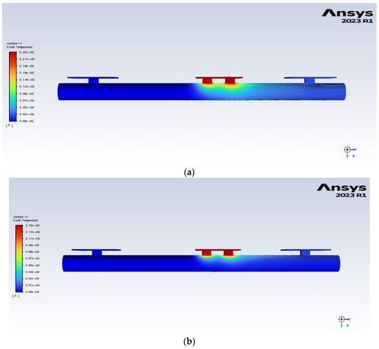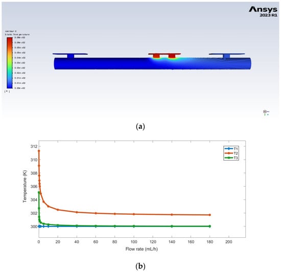 Thermal distribution profile contours (a) at a 1 mL/h flow rate and (b) at a 10 mL/h flow rate.