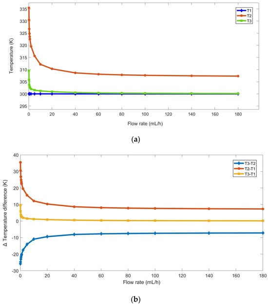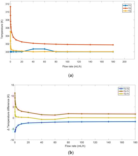 (a) Temperatures measured by sensors T1, T2, and T3 at flow rates ranging from 0.1 mL/h to 180 mL/h. (b) Visual representation of the temperature differences calculated by three temperature sensors: T3–T2, T2–T1, and T3–T1.