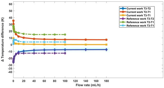 Figure 6b shows the changes in the simulated temperature differences resulting from the combinations of the three temperature sensors: T3–T2, T2–T1, and T3–T1. The sensitivity of the flowmeter is elevated at lower flow rates and reduced at higher flow rates at the micro level. Hence, this flowmeter can be used for measuring the flow at a micro level of 0–40 mL/h for better sensitivity. It can be used for applications such as drug delivery, where the greatest sensitivity and accuracy are needed. The results of the present study are in accordance with the work of D. Lee et al. [30], as shown in Figure 7, with the error falling in the band of 10–15%. The meshing considered in their work is different from that in the current work, which has a considerable impact on simulation results, and also the simulation platform used is different, leading to the mentioned deviation.