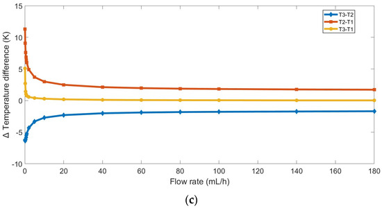 A parametric study was carried out by moving the T1 sensor 2 mm to the left, and its influence on the temperature profiles was observed as shown in Figure 8a–c. Also, the T3 sensor was moved a further 2 mm to the right, and temperature profiles were observed as shown in Figure 9a,b. From this analysis, it was observed that there was the smallest change in the sensitivity observed when varying the location of the sensors. The changes account for the temperature differences becoming constant at 45 mL/h for T1 variation and 50 mL/h for T3 variation. Therefore, this parametric study helped to find the sensitivity ranges for different positions.