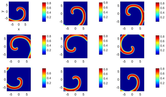 Figure 9 clearly illustrates the presence of a counter-rotating spiral wave, which is thicker and rotates much more slowly than that exhibited in Figure 2. The reason for this slowdown is that the results in Figure 9 correspond to a clockwise rotating field, which is contrary to the counter-rotating spiral wave, and the vortex diameter is large. No velocity field was used to obtain the results reported in Figure 2.