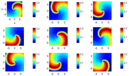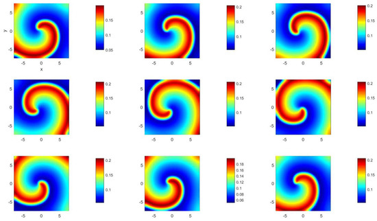 For set 1001 of Table 1 and Table 2, i.e., there is no velocity field but there is anisotropy for v, i.e., and . The results presented in Figure 1 and Figure 2 clearly indicate the presence of a counter-rotating spiral wave at different times. A similar wave was found for set 1000 from the same tables, where there is neither a velocity field nor anisotropy for u and v, i.e., and . Figure 2 also indicates that the thickness of the spiral wave arm is thicker for v than for u.