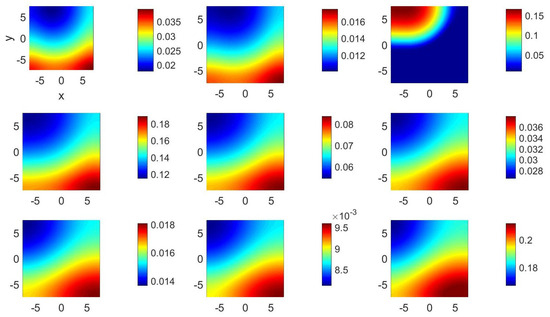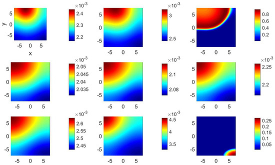 where denotes the n-th time level, and and stand for the x- and y-coordinates of the -the grid point, and, therefore, the values of p, q, and r may be easily deduced by obtaining numerical solutions with and , , and , and H and , respectively, as follows: