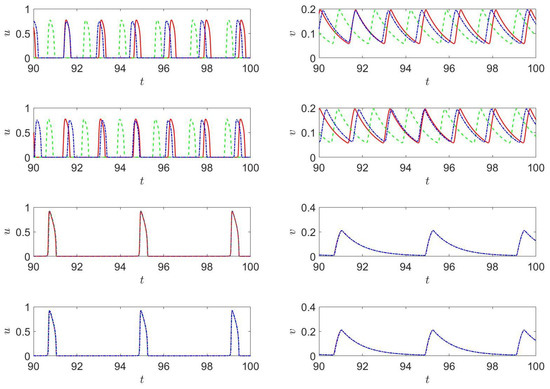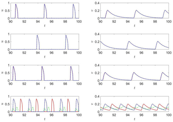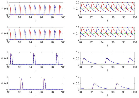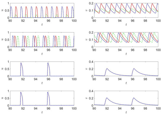 Consistent with previously discussed results for , the results presented in Figure 6 show that the maximum values of u and v for and (0.05, 0) are smaller and larger, respectively, than those for and (0.05, 0.05), and the period of the latter is larger than that of the former. Figure 6 also shows that the peak values of u and v are nearly of the same magnitudes for and (0, 0.05) (cf. compare with Figure 5).